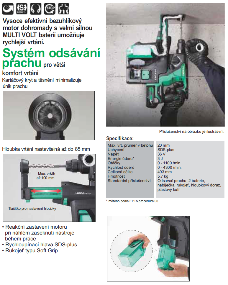- Aku vrtací kladivo DH36DPB , MULTI VOLT 36V , s bezuhlíkovým motorem , se systémem odsávání prachu , HIKOKI