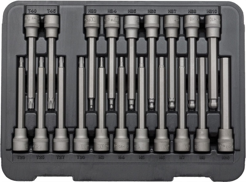 - Hlavice zástrčné 3/8", Torx-Inbus-Inbus s koulí, extra dlouhé 110 mm, S2, sada 20 dílů, Welzh