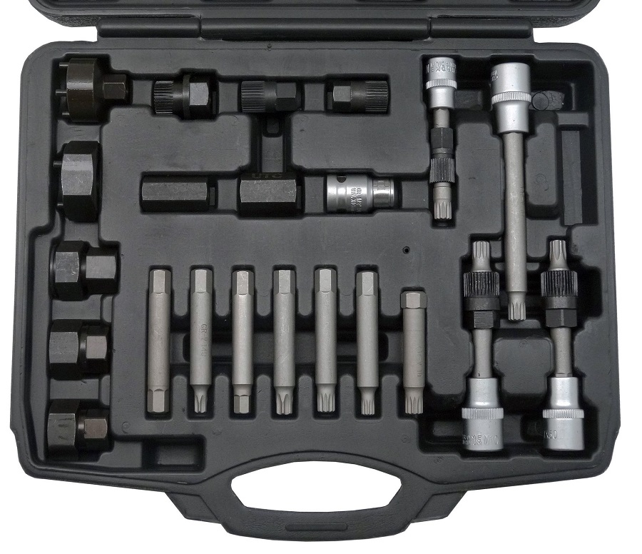 Speciální sada bitů s kombinovanými klíči pro demontáž a opravu alternátorů a uvolnění alternátorových řemenic.
